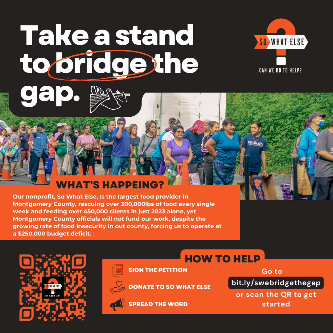 Ghost-wrote a letter on behalf of So What Else board members, which was sent to each member of the Montgomery County Council. The letter detailed their personal commitment to So What Else’s work and urged the council to invest in and support the hunger relief efforts of So What Else.